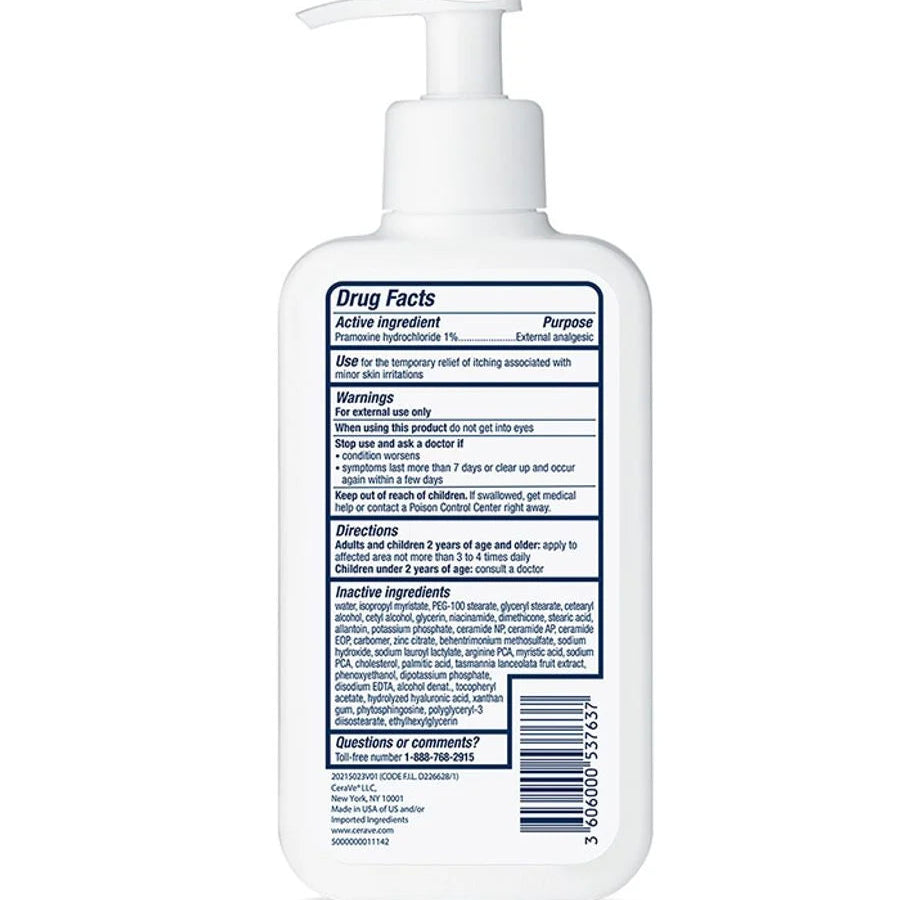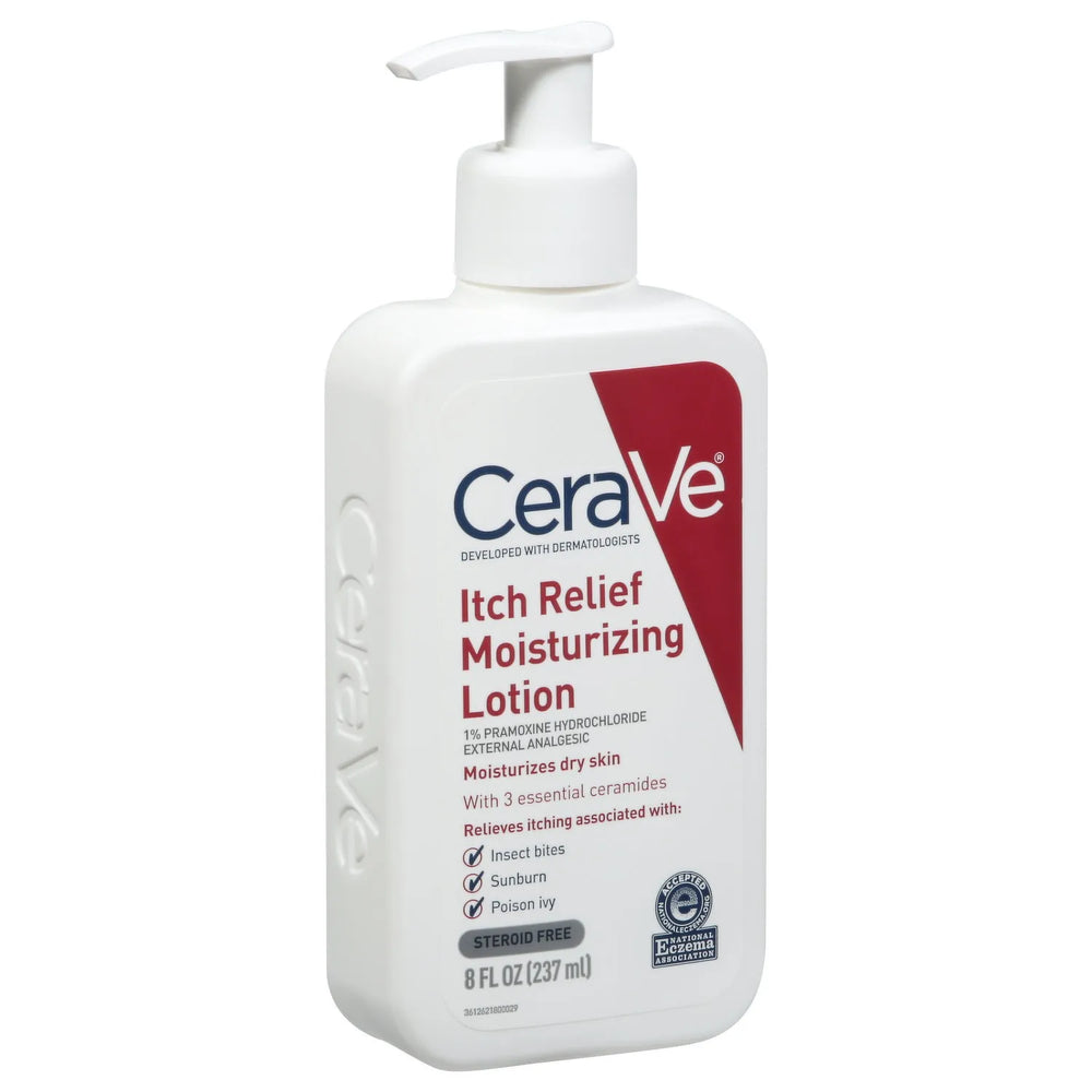 CeraVe Itch Relief Moisturizing Lotion is formulated with 1% pramoxine hydrochloride to provide fast-acting, long-lasting, temporary relief from itching associated with dry skin, insect bites, sunburn and minor skin irritations. Developed with dermatologists, our clinically tested anti-itch lotion has been found to provide relief within two minutes—and last for up to eight hours—and 100% of users experienced relief in clinical studies*. Fragrance-free, our itch relief lotion is fortified with 3 essential ceramides that work together to lock in skins moisture and help restore your skin’s protective barrier. MVE technology encapsulates ceramides to ensure efficient delivery within the skin’s barrier and slow release over time. Supporting your protective skin barrier, long after you’ve finish applying. Suitable for all skin types