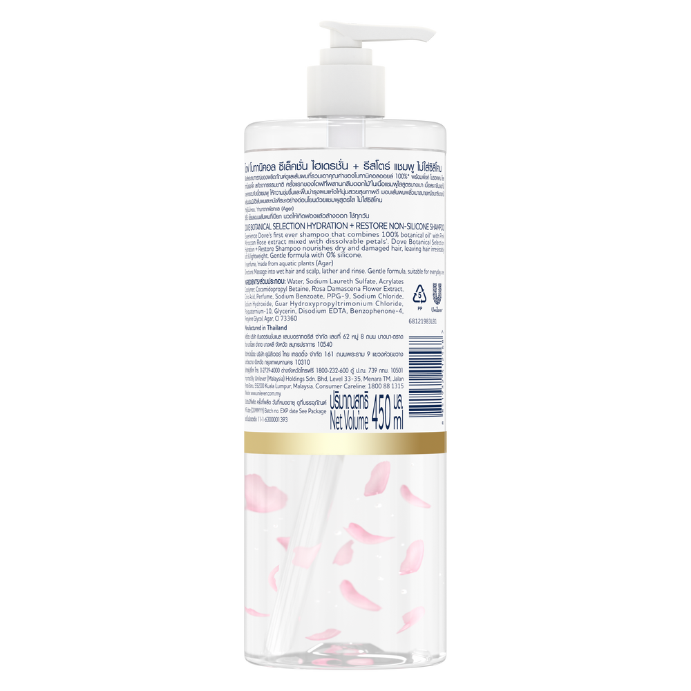 The Dove Botanical Pink Moroccan Rose Shampoo (450ml) is designed to hydrate and restore damaged hair. Its key features include: