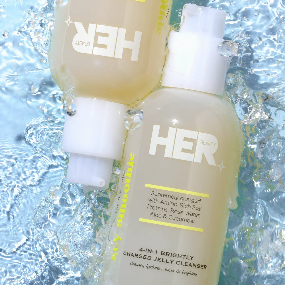 Elevate your skin care routine to the next level with our barrier boosting 4-in-1 brightly charged jelly cleanser. Powered by amino-rich soy proteins, soothing aloe, calming cucumber & rich flower water, our formula works tirelessly to improve skin's health & elasticity. Our soy smoothie, deep cleanses, removes all makeup, tones, textures, and leaves skin supple, plump and hydrated. This water enriched formula keeps your precious skin barrier intact giving your skin that bounce it craves!