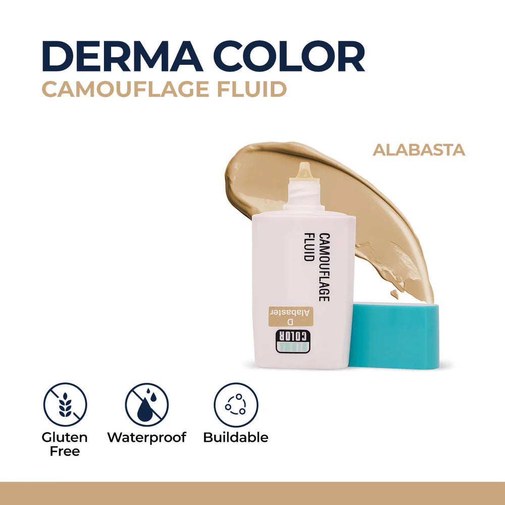 Derma Color Camouflage Fluid is a new, innovative camouflage preparation in a class of its own. Use a little sponge or your finger to apply it sparingly, with uniform distribution over a wide circle on the skin. Then allow to dry. That’s all you need for successful camouflage – that does not necessarily need powdering and is extremely waterproof. Derma Color Camouflage Fluid is primarily designed as an outstanding all-weather foundation, and for concealing somewhat larger areas of skin. The large share of vitamin E ensures a comfortable feeling on your skin.