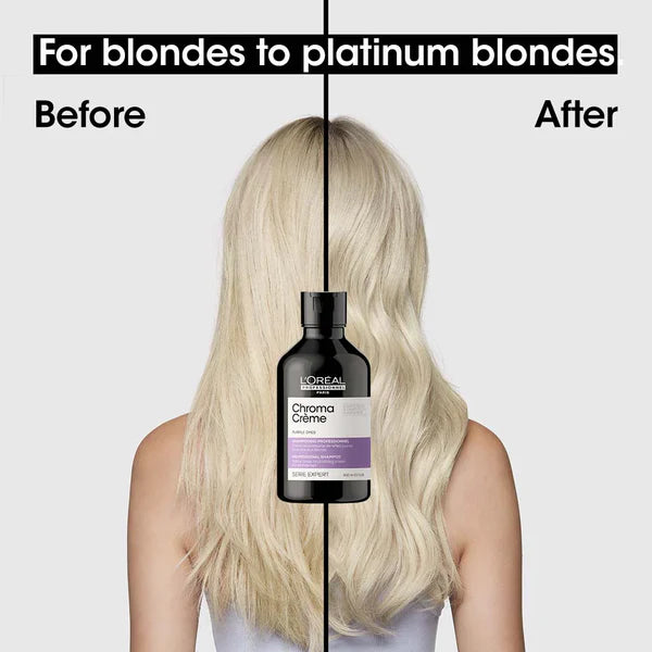 Say goodbye to brass and hello to brilliance with L’Oréal Professionnel’s Chroma Crème Purple Dyes Shampoo. Specially formulated for blonde, highlighted, or silver hair, this professional-grade shampoo neutralizes unwanted yellow and brassy tones while reviving your color’s vibrancy and shine.