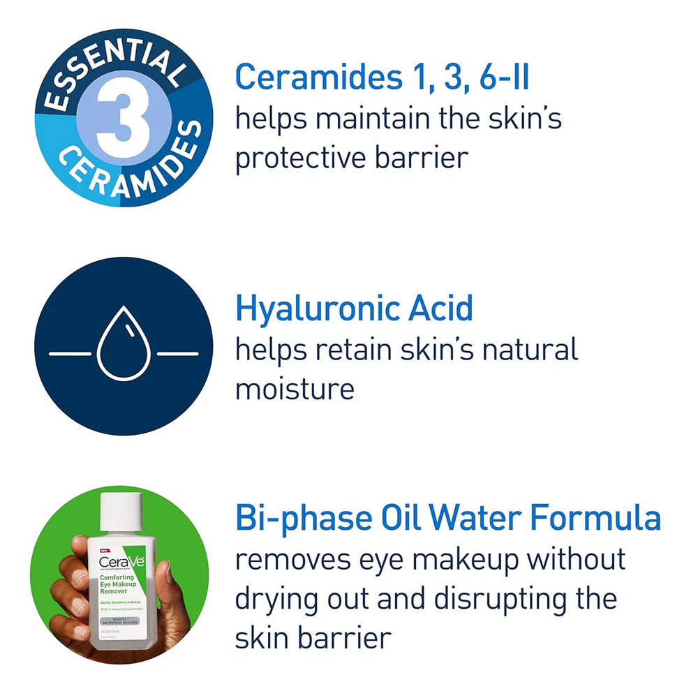 CeraVe’s Comforting Eye Makeup Remover effortlessly removes even the most stubborn eye makeup—including longwear eye makeup and waterproof mascara—without leaving your skin feeling tight or disrupting your protective skin barrier. Eye makeup remover offers a gentle yet effective way to remove makeup around your delicate eye area. Developed with dermatologists, this eye makeup remover has a bi-phase formula with a gentle, milky texture that leaves your eye area feeling soothed and comforted. Skin looks and feels refreshed without any greasy residue left behind.