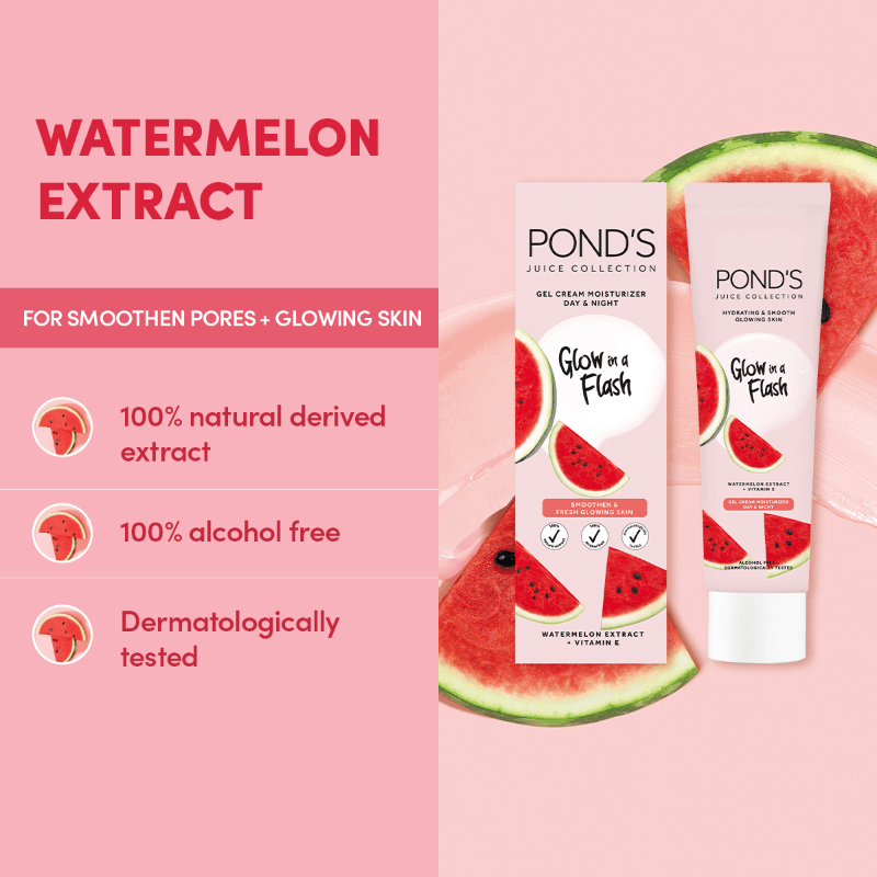 Pond's Juice Collection Glow In A Flash Facial Cleanser is a refreshing face wash line by Pond’s, available in various fruit-infused variants like Orange Nectar, Aloe Vera, and Watermelon Extract. These cleansers are designed to brighten and hydrate the skin, leaving it feeling fresh and glowing.