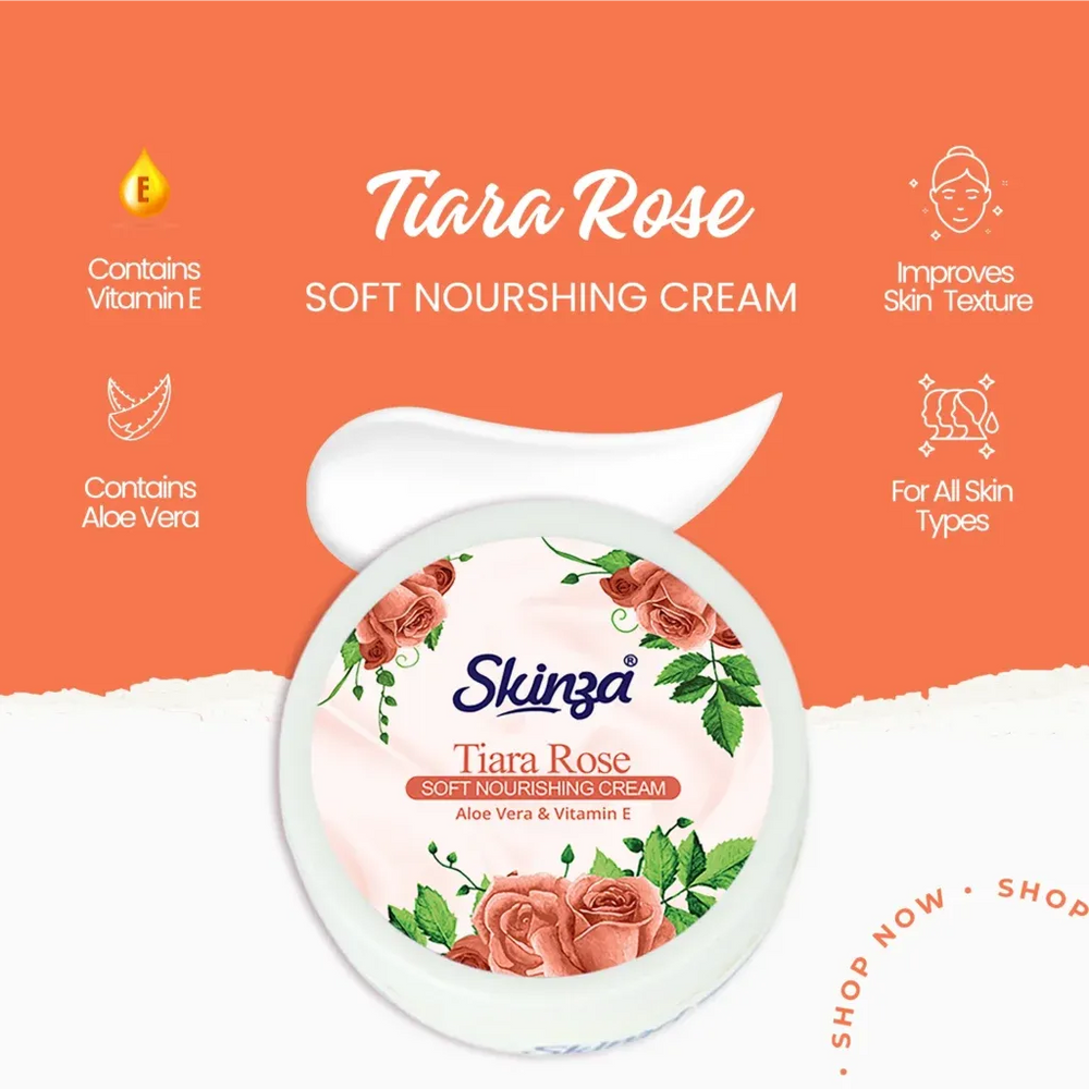 Pamper your skin with the luxurious Skinza Tiara Rose Nourishing Cream. Infused with natural rose extracts, this 150 ml cream deeply hydrates, nourishes, and revitalizes the skin, leaving it soft, smooth, and radiant. Its lightweight yet rich texture absorbs easily, making it ideal for daily use on face, hands, and body.