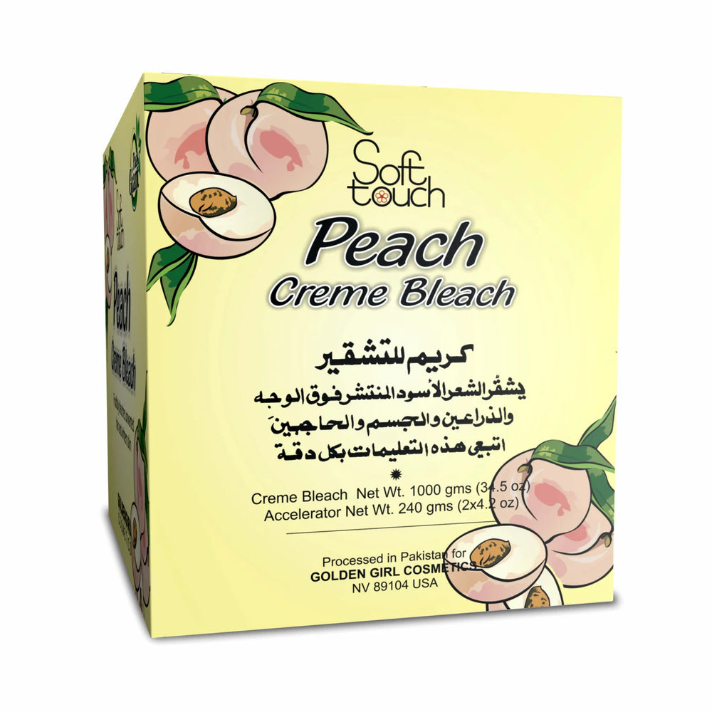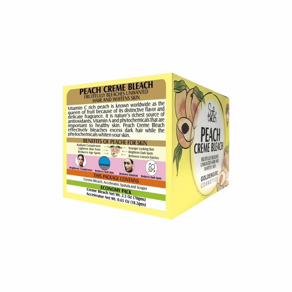 Golden Girl Peach Creme Bleach fruitfully bleaches excess dark hair of the face, neck, arms and legs that results in vibrant and whitening skin. It diminishes the appearance of dark spots and decreases the growth of melanin to lighten and brighten the skin. It also prevents skin from being tanned due to sun rays. Peach creme bleach hydrates the dull and dry skin and leaves the skin smooth, hair pale, soft and glowing.