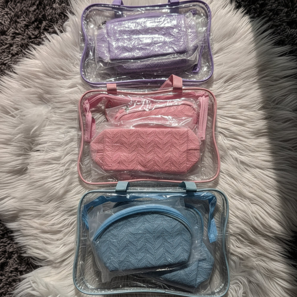 The Long "Brush" Pouch: A slim, rectangular bag specifically for your makeup brushes, eyeliners, and the 3Q Beauty Matte Lip Glosses. It keeps long items from getting lost at the bottom.