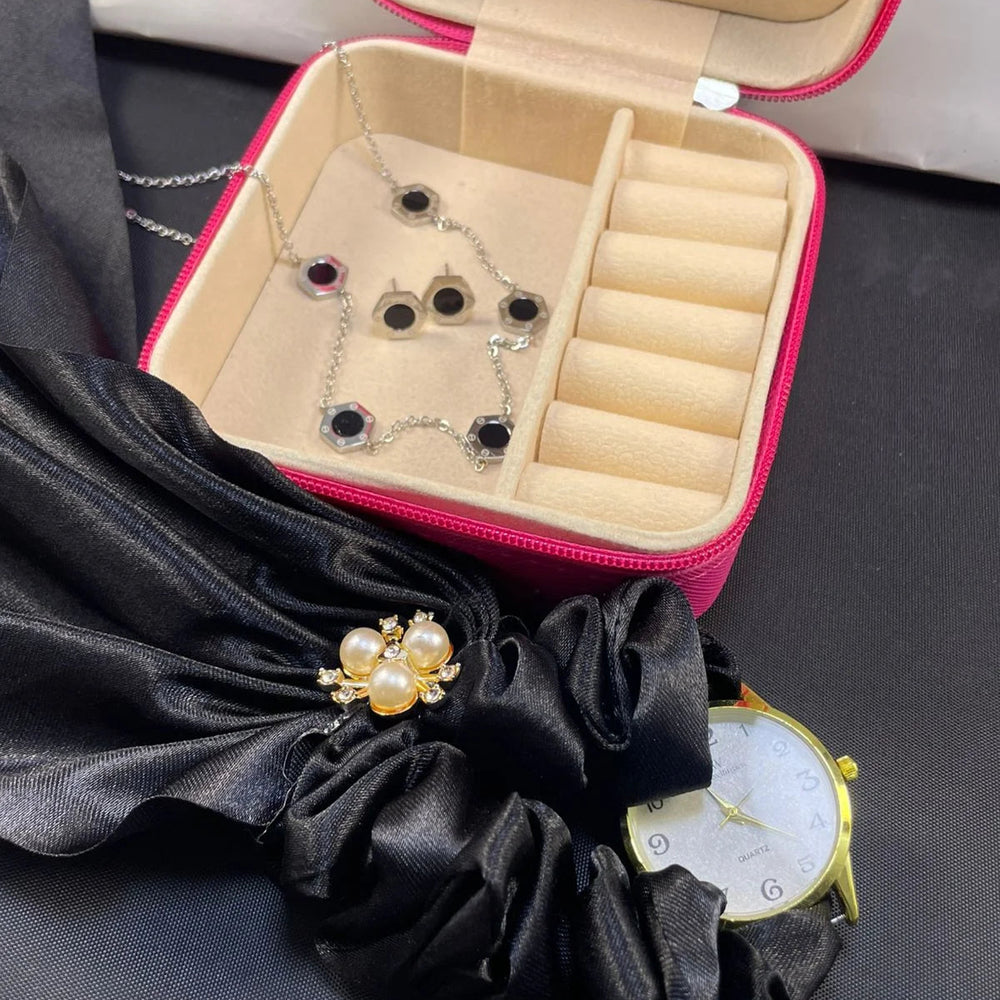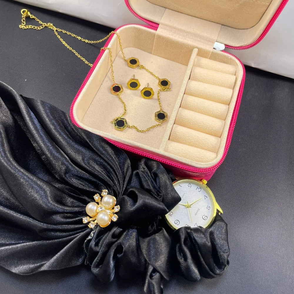 A complete luxury jewelry and accessory bundle featuring a stainless steel jewelry set, a stylish watch, and a premium organizer box. Perfect as a gift or a personal treat, this deal combines style, durability, and practicality in one.