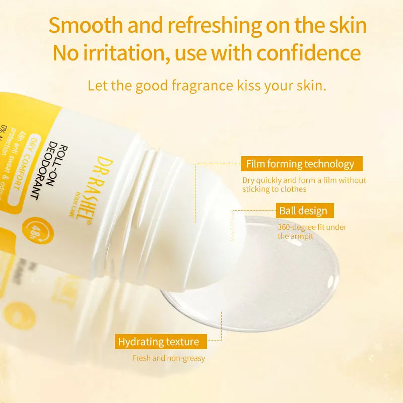 Stay fresh and confident all day with Dr. Rashel Dry Comfort Roll-On Deodorant, offering powerful 48-hour sweat and odor protection. Its gentle, skin-friendly formula keeps underarms dry, smooth, and comfortable without irritation. Designed for daily use, this roll-on provides a clean, refreshing scent that lasts, ensuring long-lasting freshness even in hot weather. Ideal for both men and women.