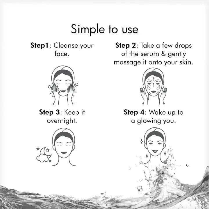 A night serum formulated with Vitamin C, niacinamide, hyaluronic acid, mandarin extract, and caesalpinia fruit extract—designed to fade dark spots, soothe skin, and improve firmness while you sleep