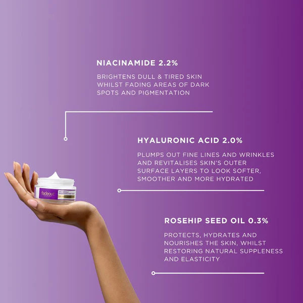 Restore youthful radiance and wake up to smoother, brighter skin with Fade Out Anti-Wrinkle Brightening Night Cream - 50ml, a powerful overnight treatment designed to target fine lines, wrinkles, and uneven skin tone. This advanced formula works while you sleep to deeply hydrate, reduce visible signs of aging, and reveal a refreshed, youthful complexion by morning.