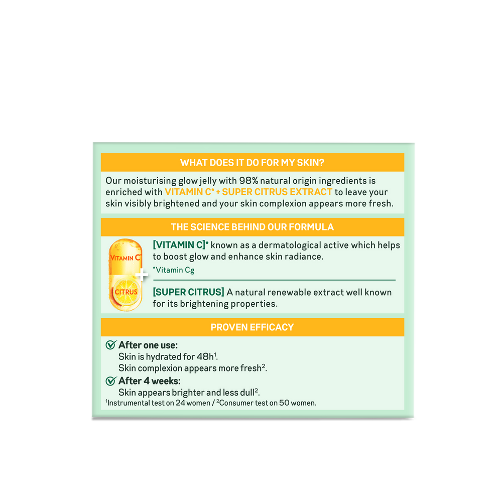 Revive dull, tired skin with the Garnier Skin Active Vitamin C Brightening Glow Jelly Moisturiser, a lightweight gel-cream designed to hydrate, brighten, and energize your complexion. Powered by vitamin C and fruit extracts, this jelly-textured moisturizer absorbs instantly, delivering a burst of freshness and glow without any greasy residue.