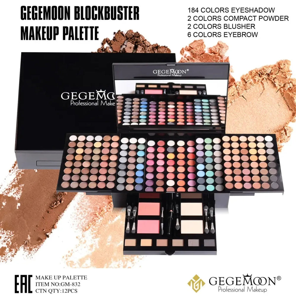 The GEGEMOON Blockbuster Makeup Palette is the ultimate all-in-one solution for beauty lovers, professional makeup artists, and anyone who enjoys experimenting with bold, vibrant, or natural looks. Designed to deliver maximum versatility and premium quality, this makeup kit combines an extensive range of 184 highly pigmented eyeshadow colors, 2 compact powders, 2 blush shades, and 6 eyebrow colors—all neatly packaged in a portable and stylish palette.