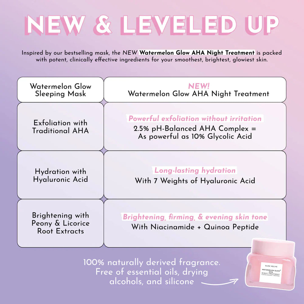 Wake up to glowing, baby-soft skin with the Glow Recipe Watermelon Glow AHA Night Treatment. This lightweight, pillow-proof overnight mask is powered by a gentle yet effective blend of AHA (alpha hydroxy acids) and hyaluronic acid, working through the night to smooth texture, refine pores, and deeply hydrate for a visibly brighter, clearer complexion by morning.