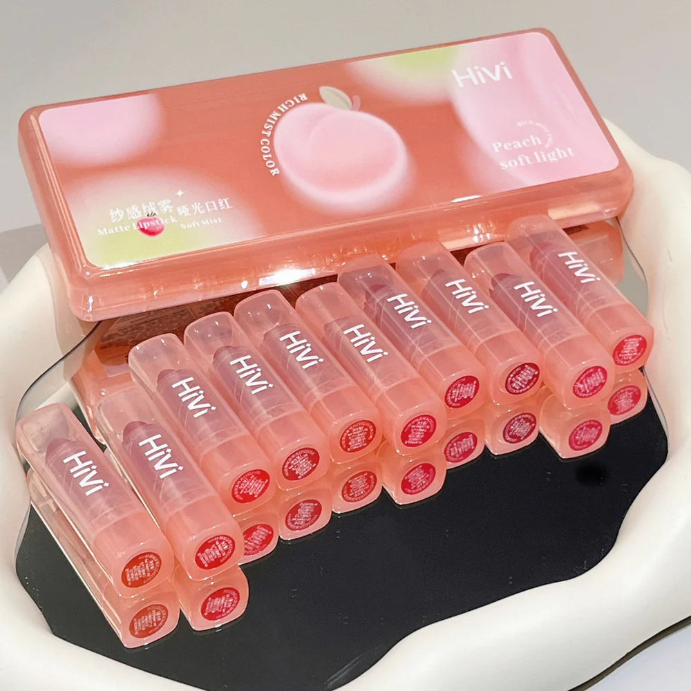 This HiVi 10 Pcs Peach Soft Light Matte Lipstick Set is a must-have for any makeup collection. With a variety of 10 shades of peach, these lipsticks offer long-lasting and non-drying color. Achieve a soft, matte finish that will elevate any look.