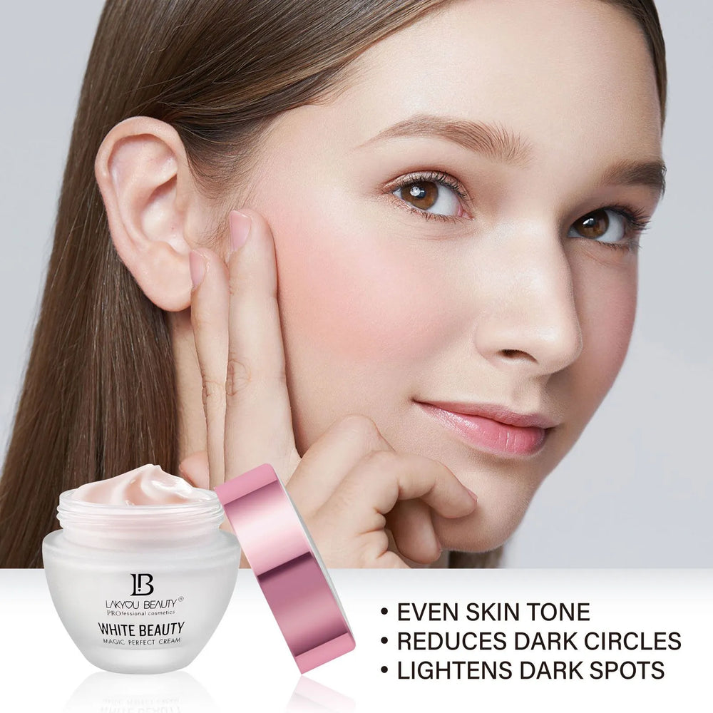 White Beauty Magic Perfect Cream is an all-in-one skincare solution designed to transform your complexion. This cream combines brightening and hydrating properties to help achieve a radiant, even skin tone while reducing the appearance of dark spots and blemishes. Infused with nourishing ingredients, it works to deeply moisturize the skin, leaving it soft, smooth, and glowing. The lightweight, non-greasy formula absorbs quickly, making it ideal for daily use. With regular application, White Beauty Magic Perfect Cream reveals a luminous and flawless complexion, enhancing your natural beauty.