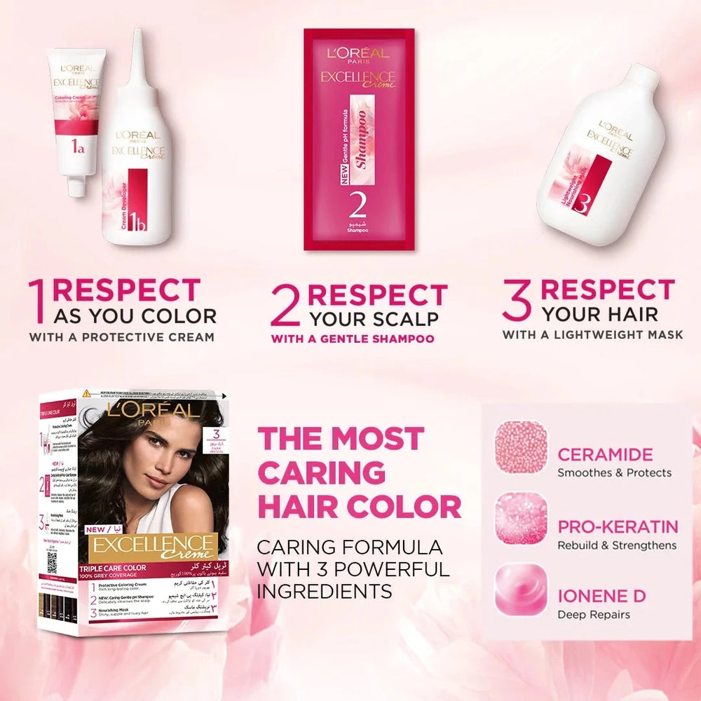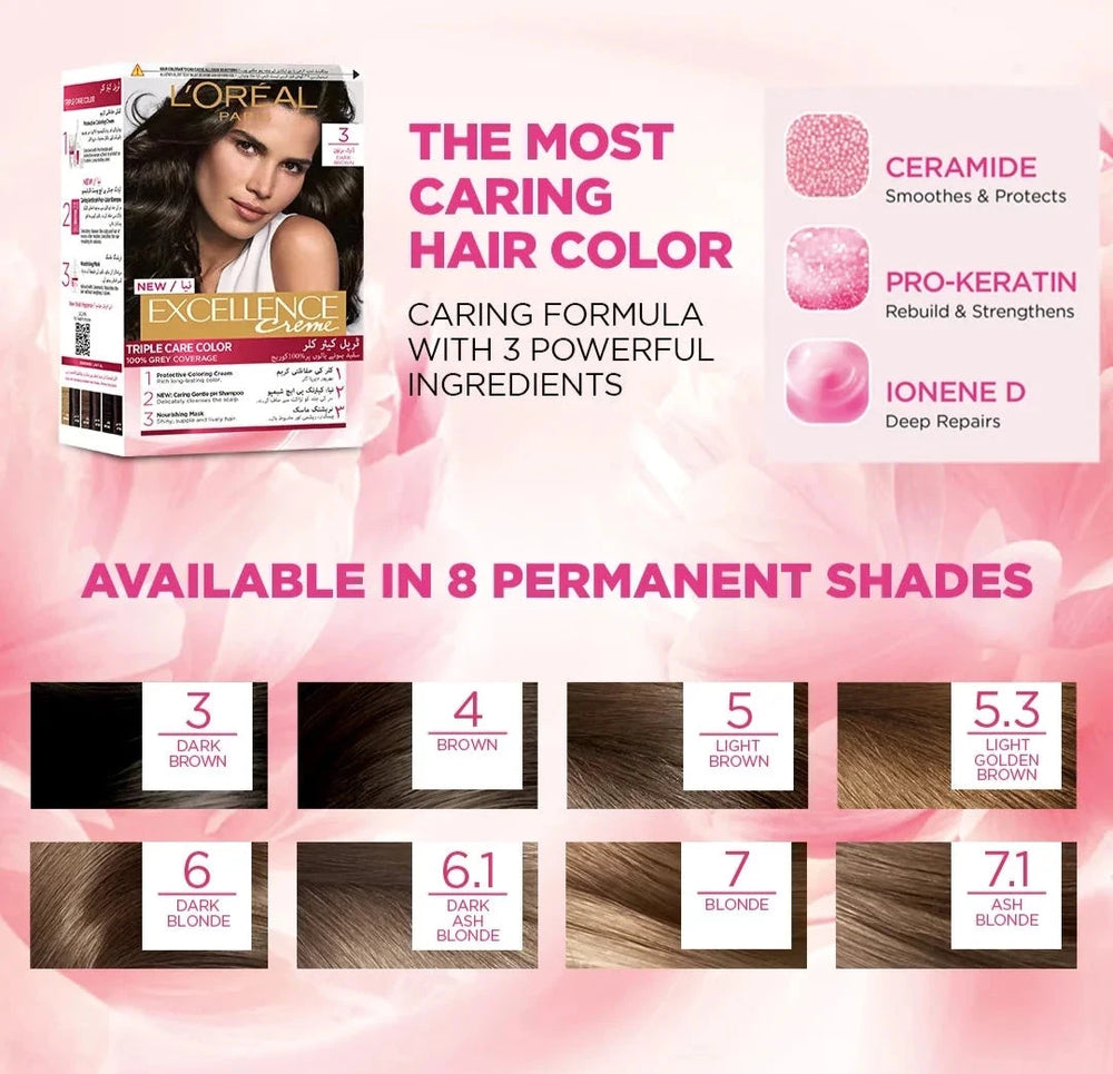 Discover the sophisticated and cool shade of L’Oréal Paris Excellence Crème in 6.1 Dark Ash Blond. This premium hair color offers 100% gray coverage with rich, vibrant results that last. Infused with a blend of Pro-Keratine, Ceramide, and Collagen, it strengthens and protects your hair during the coloring process, leaving it healthy, silky, and shiny. The non-drip crème formula ensures easy and precise application, delivering flawless color from root to tip. Perfect for those seeking a refined, ash blonde hue with a cool undertone, L’Oréal Paris Excellence Crème 6.1 Dark Ash Blond provides salon-quality color in the comfort of your home.