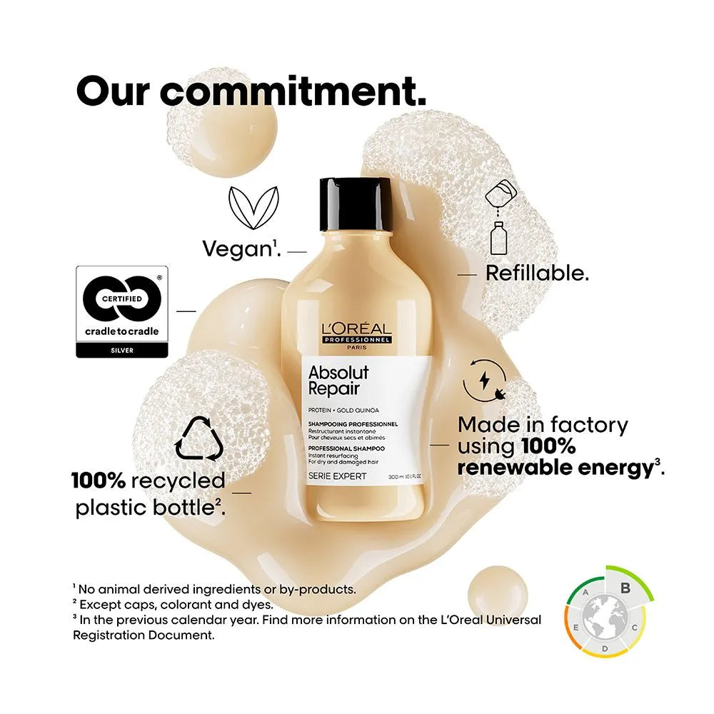 Revive dry and damaged hair with the L'Oréal Professionnel Serie Expert Absolut Repair Shampoo, enriched with Protein and Gold Quinoa extract. This professional-grade formula gently cleanses while delivering intense nourishment and repair to weakened strands, restoring softness and shine without weighing the hair down.