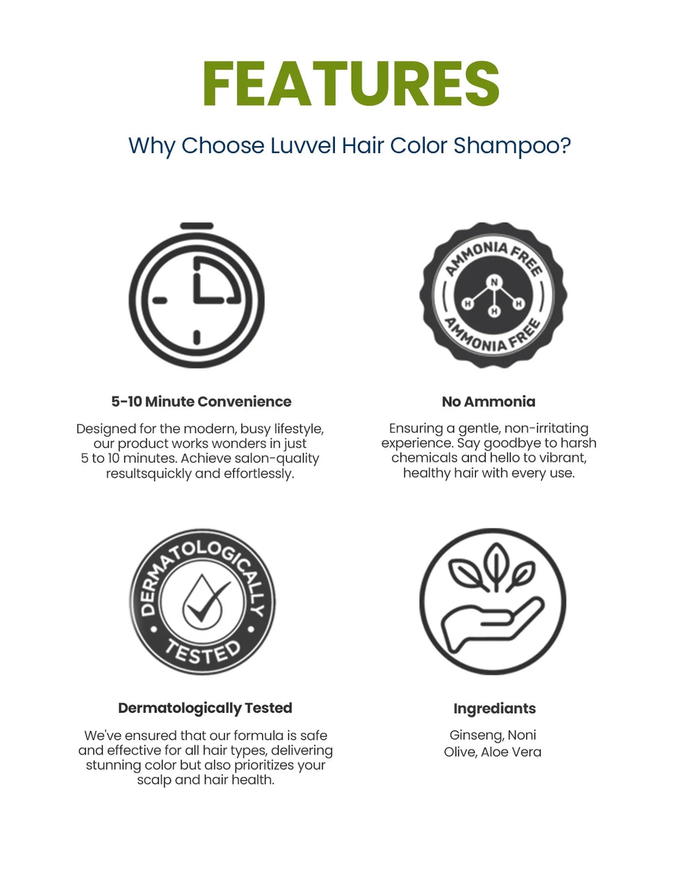 The Olive Oil in the formula helps to hydrate and nourish your hair, preventing dryness and adding a natural shine. LUVVEL Hair Color Shampoo is ideal for covering grays, enhancing natural hair color, or simply adding a fresh, vibrant hue to your locks. The easy-to-use shampoo formula allows for quick and effortless application, making hair coloring a hassle-free experience.