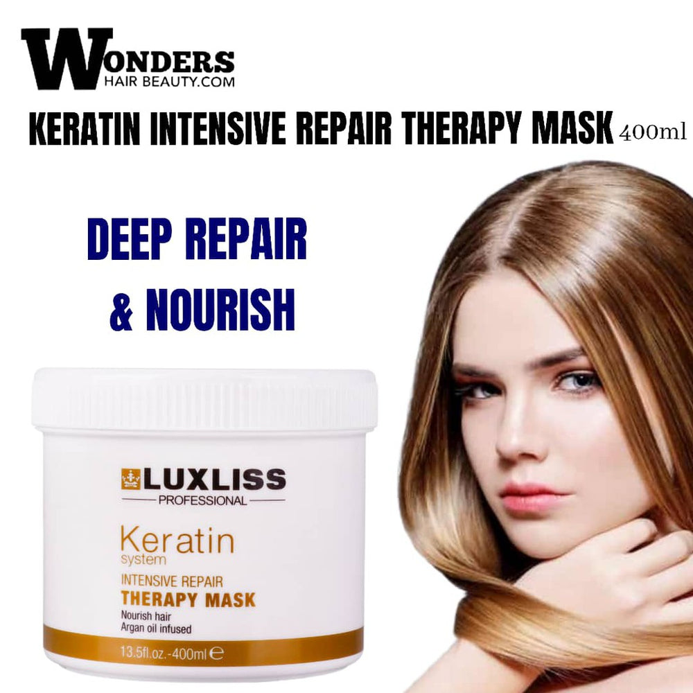 Luxliss Moisture Repair Therapy Mask 400ml is a professional-grade hair treatment designed to restore and revitalize damaged hair. Infused with keratin protein and enriched with argan oil, this mask offers vital restructuring elements that attach to damaged hair, helping to restore protein deficiencies. Its protein-enriched formula restructures and fortifies the hair, improving its texture without weighing it down. Ideal for chemically and color-treated hair, it hydrates and restores hair’s natural balance, enhancing elasticity, shine, and manageability.