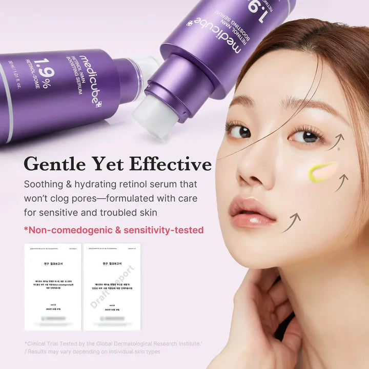 Experience advanced age-defying skincare with the Medicube Retinol NMN Boosting Serum 30ml. This powerful serum combines 99.8% pure Retinol-some (1.9%) and 99% pure NMN (Nicotinamide Mononucleotide) to deliver visible firming, wrinkle reduction, and skin renewal. Infused with Hyaluronic Acid, Vitamin C, Panthenol, and Ceramides, it deeply hydrates and strengthens the skin barrier for a smoother, firmer, and radiant complexion. Its low-irritation formula ensures maximum efficacy with minimal sensitivity—perfect for all skin types, including acne-prone or delicate skin.