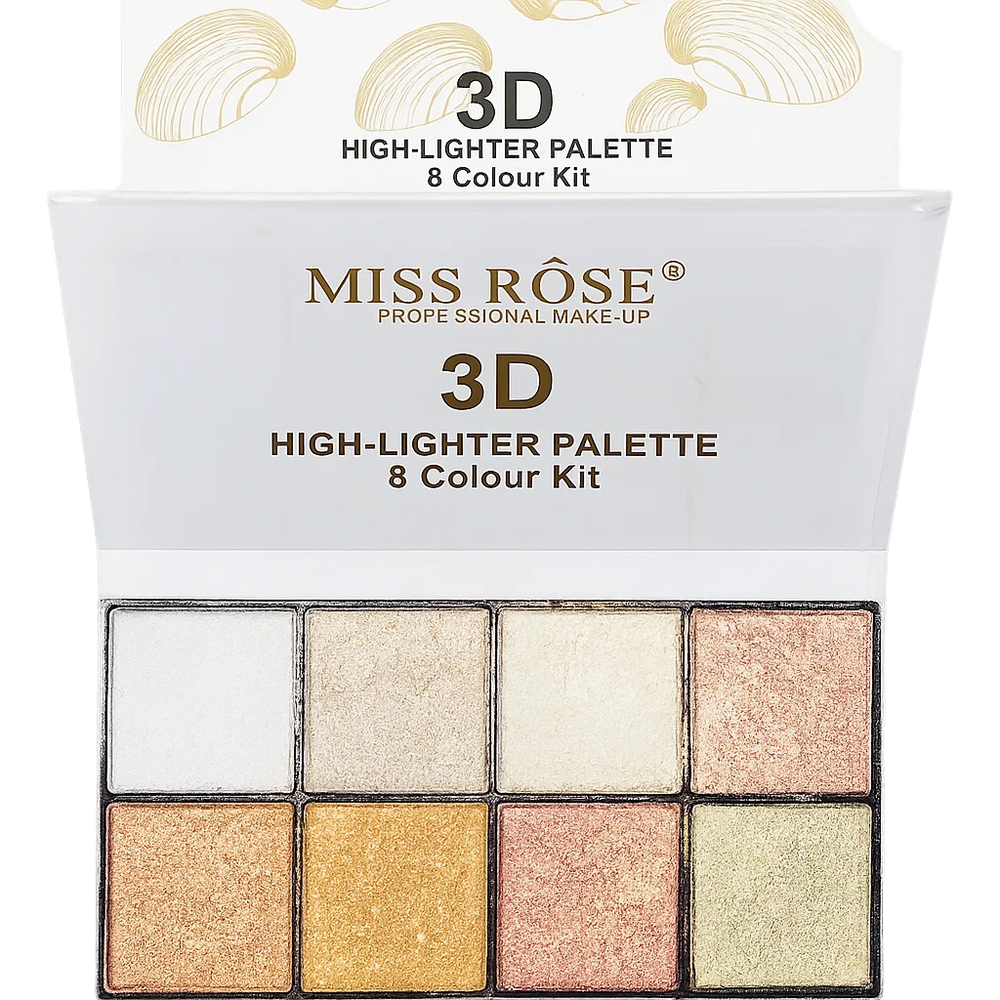 The Miss Rose Highlighter 3D 8 Colour Kit is a makeup product featuring an assortment of eight different highlighter shades designed to accentuate and illuminate specific areas of the face. Here's an overview: