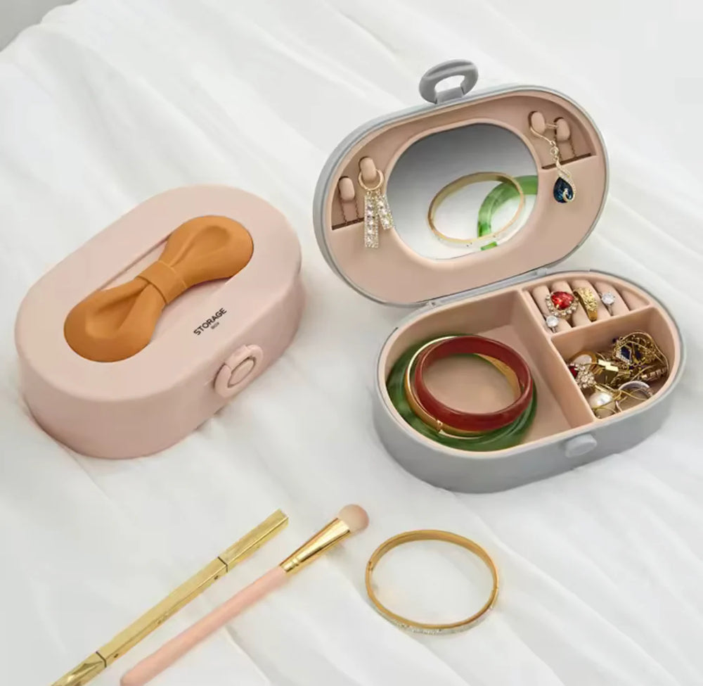This potable bowknot jewellery organiser box is an elegant and multifunctional storage solution designed to keep your jewelry neatly organized and easily accessible. Featuring a stylish bowknot design, this decorative container is perfect for storing necklaces, earrings, bracelets, and other accessories. Its compact, portable structure makes it ideal for travel or home use, while the multiple compartments ensure that each piece is securely stored to prevent tangling or damage. This chic jewellery box combines practicality with aesthetic appeal, making it a perfect addition to any vanity or dressing table.