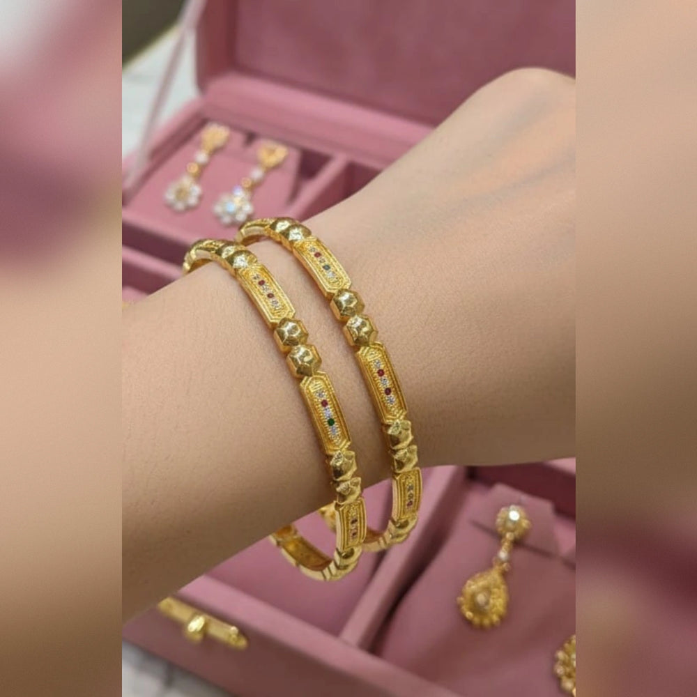 The Rajwari 2-Pcs Bangles Set features elegant traditional craftsmanship inspired by classic Rajwari design. With a rich finish and refined detailing, these bangles add grace and sophistication to ethnic and festive outfits, making them a perfect accessory for special occasions.