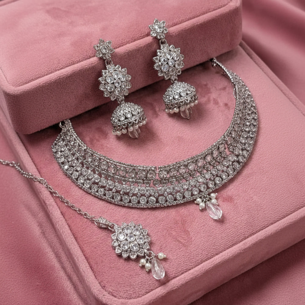 The Rivas AD Necklace Set is an elegant jewelry collection designed to enhance traditional and bridal looks. Featuring sparkling AD stones combined with classic jhumki earrings, a matching tikka, and pearl crystal detailing, this set offers a luxurious and graceful appearance.