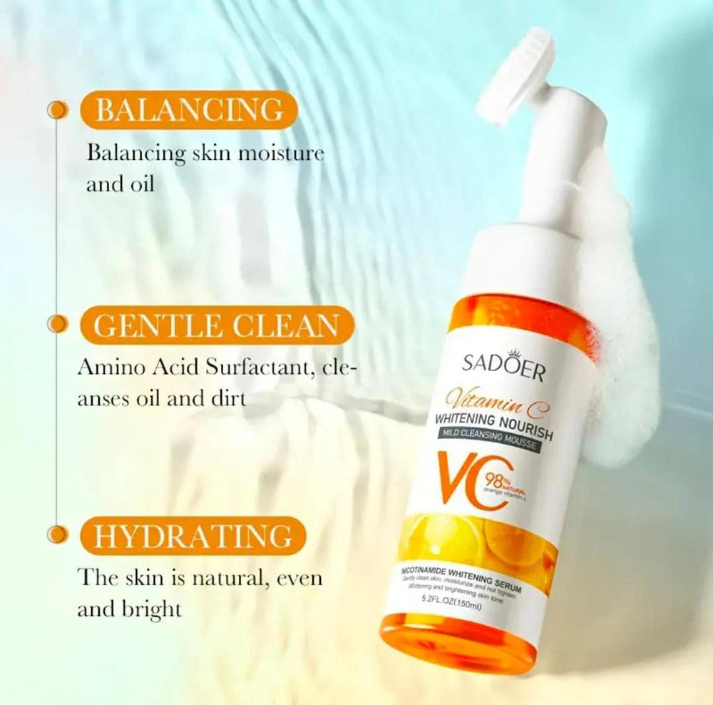 Sadoer Vitamin C Whitening Nourishing Mild Cleansing Mousse is a 150ml facial cleanser designed to brighten, nourish, and refresh your skin. Enriched with Vitamin C, this gentle mousse effectively removes impurities, excess oil, and makeup residue without stripping the skin's natural moisture, promoting a radiant and healthy complexion.