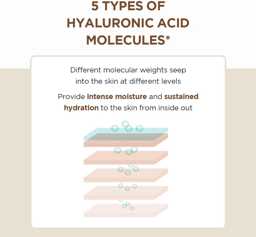 - Contains 5 sizes of hyaluronic acid molecules to layer moisture into the skin from the inside out