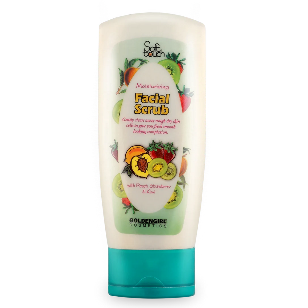 Moisturizing Facial Scrub by Soft Touch Golden Girl, natural extracts of Peach, Strawberry, and Kiwi have been combined to create a perfect delicate moisturizing blend. Moisturizing facial scrub gently clears away dull, dry skin cells with a unique fruity fresh moisturizing formula to provide you a fresh smooth looking complexion.
