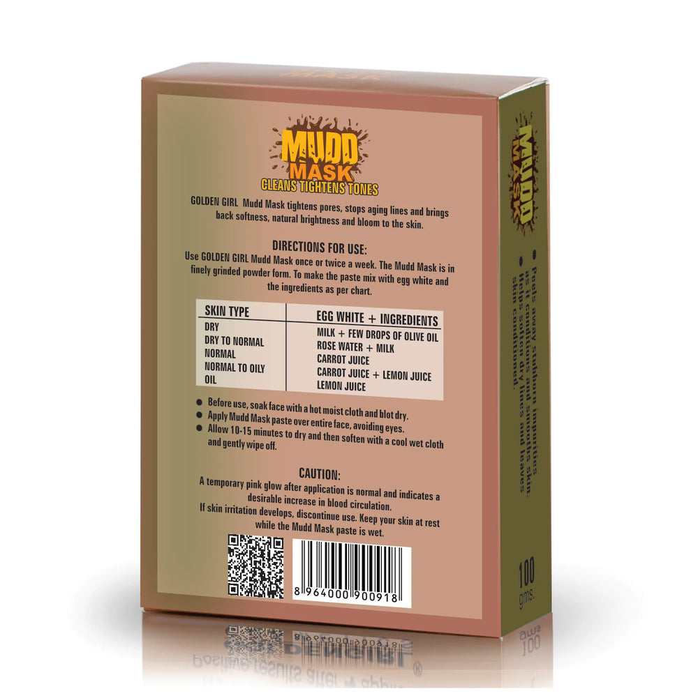 Use GOLDEN GIRL Mudd Mask once or twice a week. The Mudd Mask is in finely grinned powder form. To make the paste mix with egg white and the ingredients as per chart.