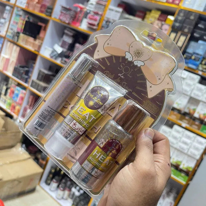 Experience the captivating allure of the Sol New Heat Scorching Fragrance Set, featuring a body mist, perfume, and lotion. This expertly crafted trio delivers a harmonious blend of scents designed to invigorate and refresh your senses throughout the day. The body mist offers a light, refreshing layer, while the perfume provides a lasting, sophisticated aroma. Complemented by the moisturizing lotion, this set ensures your skin stays hydrated and subtly scented. Ideal for those seeking a balanced fragrance experience with added skincare benefits.