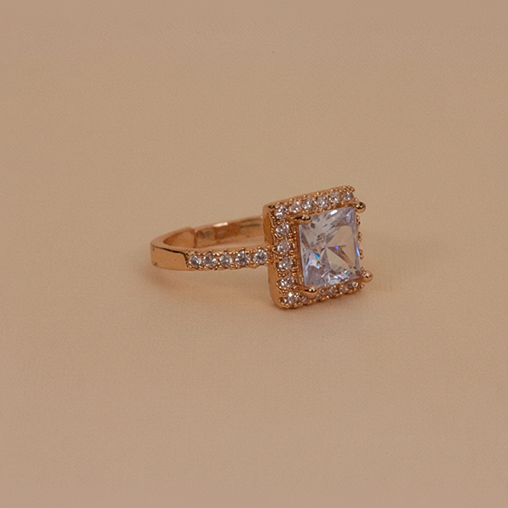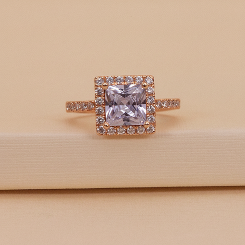This ring draws attention with its symmetrical halo setting and radiant sparkle. The square frame adds a contemporary edge to a classic silhouette, making it a standout accessory for engagements, gifts, or personal style statements.