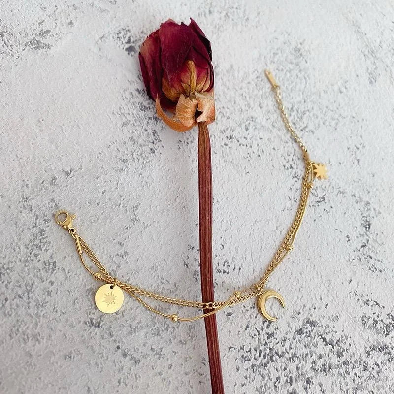 Bring a touch of celestial beauty to your wrist with this Stainless Steel Celestial Charm Bracelet. Featuring cosmic-inspired charms like stars, moons, and other heavenly motifs, this bracelet blends modern design with timeless symbolism — perfect for elevating everyday looks or adding sparkle to special occasions.