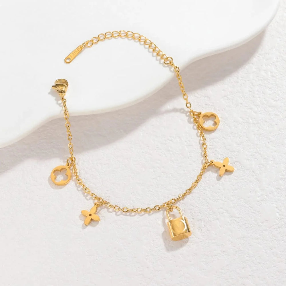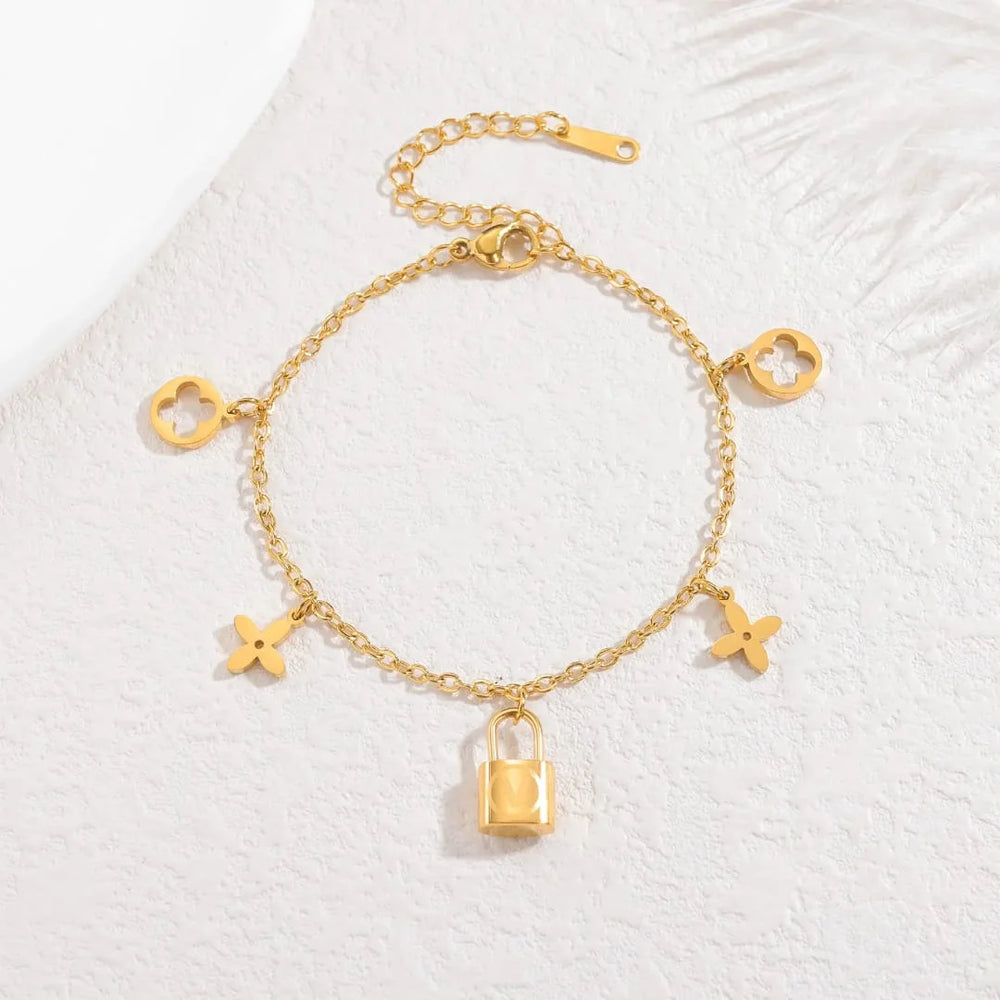 Add elegance and charm to your wrist with this Stainless Steel Lock Charm Bracelet, featuring a beautiful clover and flower motif. Combining timeless design with everyday versatility, this bracelet is a delightful blend of style and significance — perfect for casual wear or special occasions.