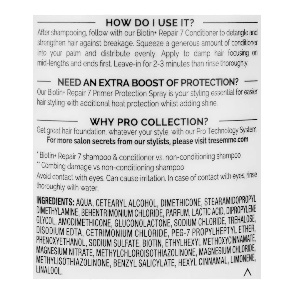 Apply: After shampooing with TRESemmé Biotin + Repair 7 Shampoo, apply a generous amount of conditioner to damp hair.