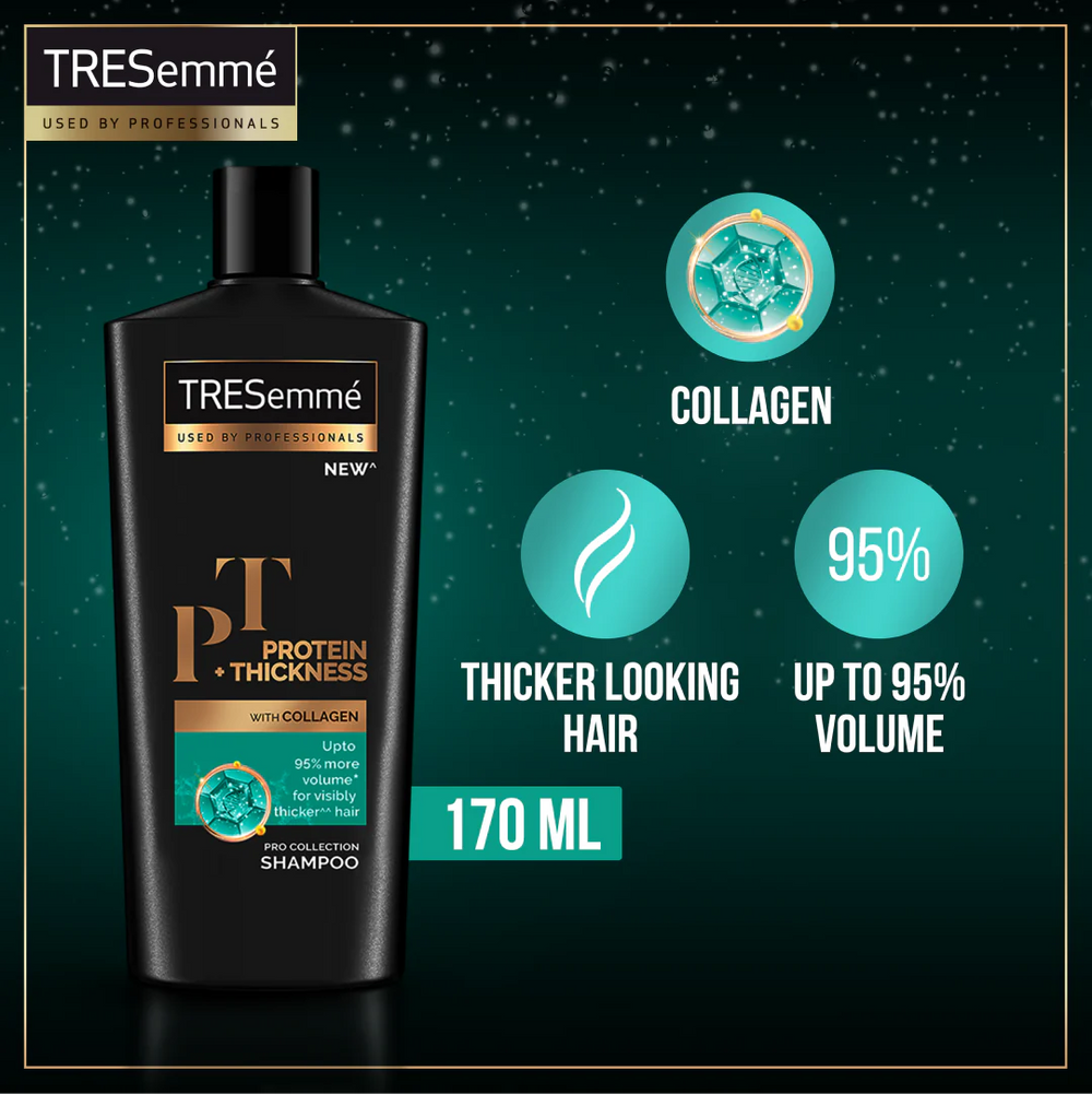 TRESemmé Protein+ Thickness Shampoo is formulated to enhance hair volume and strength. Enriched with collagen and proteins, it aims to provide visibly thicker and fuller hair with regular use.
