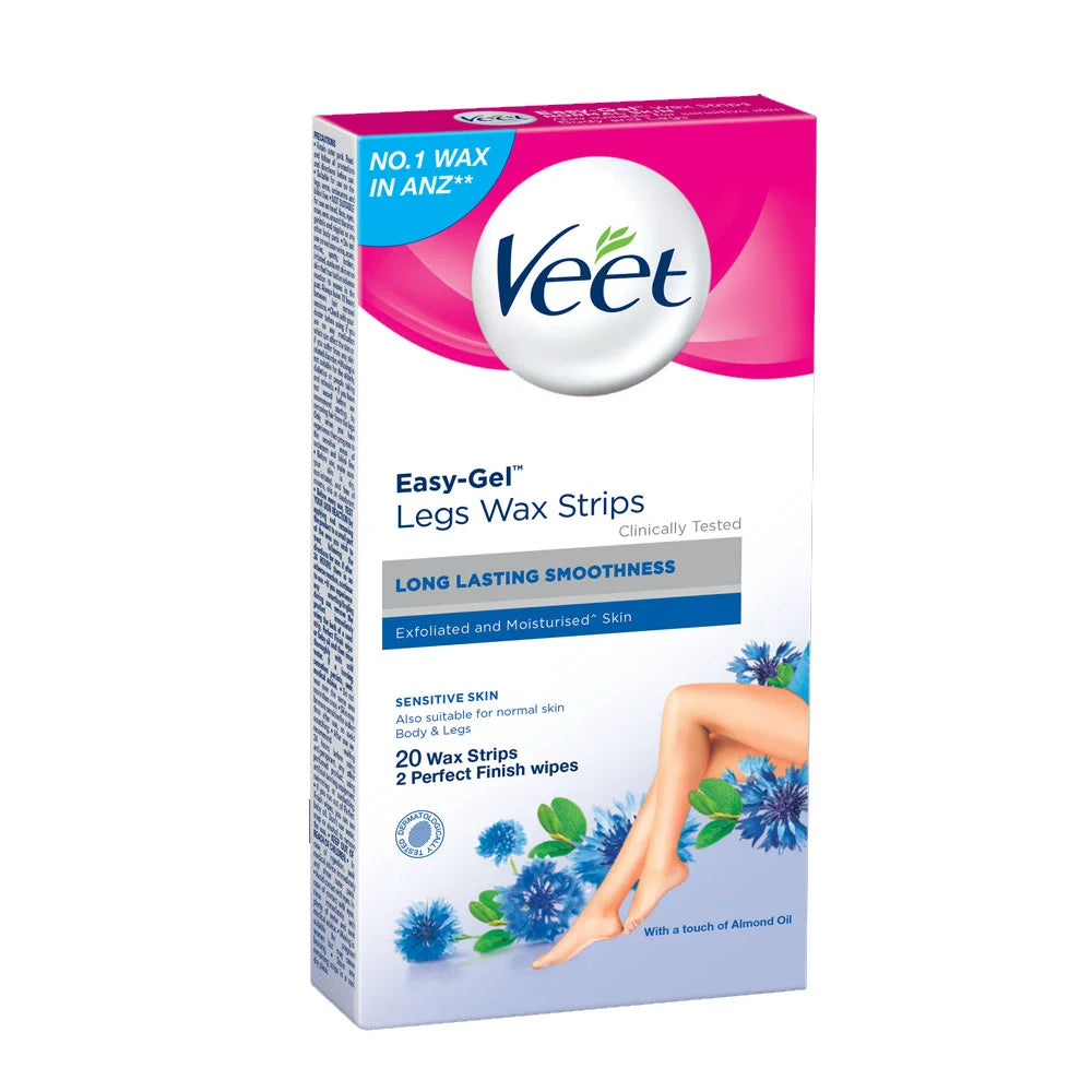 Veet Easy Gel Body & Legs Wax Strips Sensitive Skin is a ready-to-use hair removal solution designed especially for sensitive skin that offers smooth, hair-free legs and body without the mess of traditional waxing.