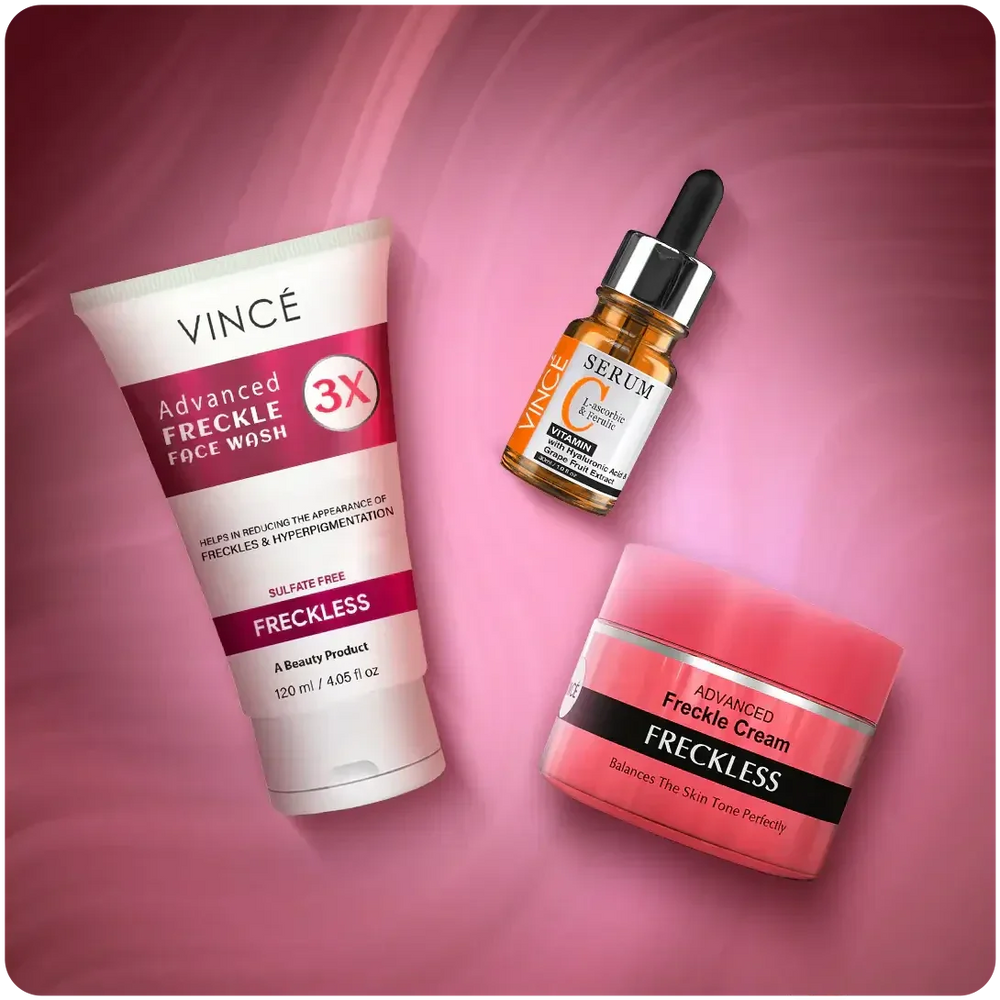 Vince Freckle Challenge Kit is a trial & tried 30 days skin-reviving challenge for hyperpigmented, discolored, and dark skin. This ultra-powerful kit helps reduce the appearance of dark and resistant freckles, reduces irregular pigmentation & inflammation, and also helps to remove dark spots & discolorations. It helps to reveal lighter, brighter, even-toned, and glowing skin.